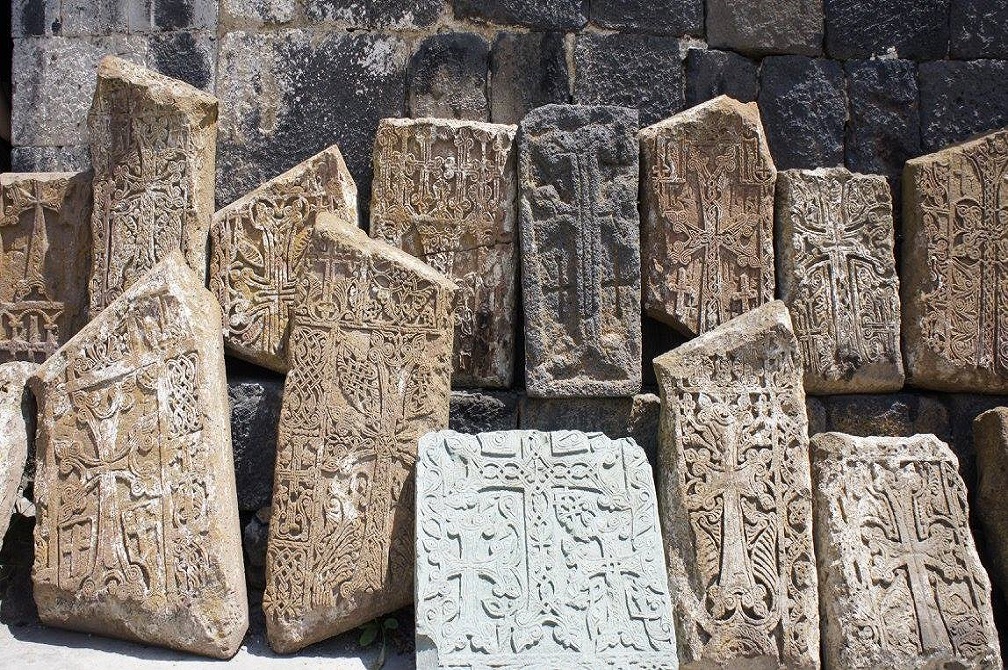 Große und kleine, schwarze , weiße und bunte Steine… Sie sind überall in Armenien. Die Steine sind die sprachlosen Zeugen der Geschichte Armeniens. Sie verbergen die Geschichte von Tausenden von Jahren, in denen es Freude und Traurigkeit, Schmerz und Leid gibt… Aber wenn man aufhorcht, kann man ihren Schrei hören… Sie werden von Siegen und Niederlagen des armenischen Volkes erzählen, von seiner harten Arbeit, Liebe und Hingabe, dem Schmerz und unerschütterlichem Willen. Die Verbundenheit der Armenier mit dem Stein des Landes ist tief verwurzelt. Die magischen Steine haben in Armenien ihren originellsten Ausdruck in den Kreuzsteinen gefunden. Kreuzsteinkunst ist nicht bloß eine Kunst. Das ist auch die Lebensweise, den christlichen Armeniern die Möglichkeit gibt richtig zu leben. Der Kreuzstein ist das Gebet der Armenier zu Gott. Ein Kreuzstein (armenisch Chatschkar)ist ein Flurdenkmal, das aus einer aufrecht stehenden Steinplatte mit einem erhabenen oder eingemeißelten Kreuz besteht. Der Kreuzstein wurde zur Brücke zwischen Himmel und Erde und zum Schlüssel der Tore des Himmels”.