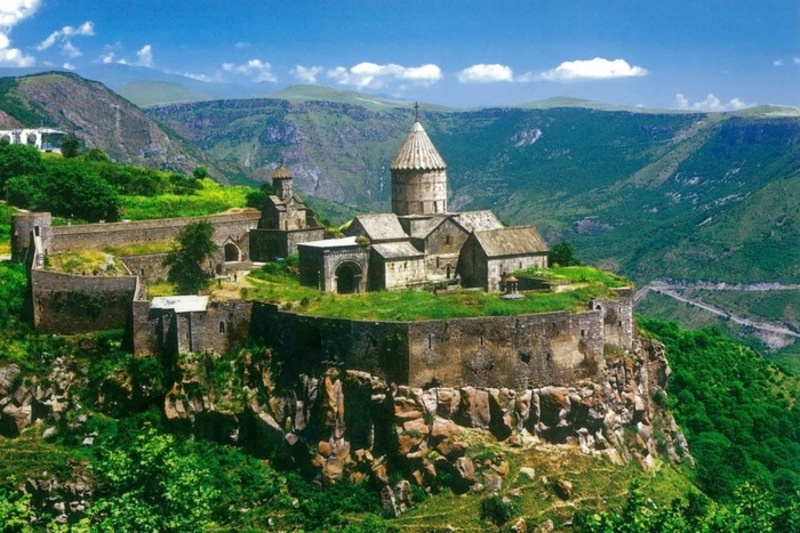 After a breakfast we drive to Khndsoresk, the cave settlement at the charming gorge, which can be reached by the swing bridge. The environment fascinates by the varying landscape scenarios. In the afternoon we explore the mighty Vorotan Gorge, at the abyss in an exposed position the monastery Tatev (9th century), there was a famous university in the Middle Ages. With the cable car "Wings of Tatev" (5.7 km) we will reach the monastery. Before the visit, we will enjoy local dishes with a family in the garden. Drive to Vayots Dsor. Overnight is in the village of Hermon or close to Yeghegnadsor. (b/l)