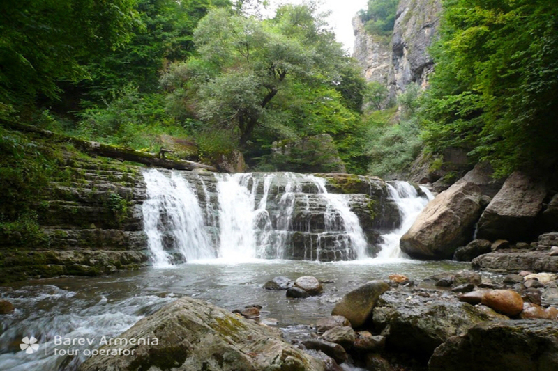 Ein Sonnenaufgang mit Rundblick, Berge und Täler, einfach großartig! Nach dem Frühstück nutzen wir die grandiose Lage von Yenokavan und wandern über die offenen Wiesen in der Schlucht Lastiver mit kleinen Hütten auf den Bäumen und sprudelndem Fluss. (GZ: 3 1/2 Std., + 230 m, - 400 m). Fahrt zurück nach Jerewan. (F/M)